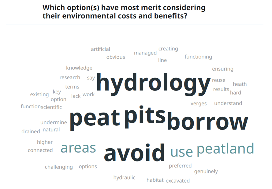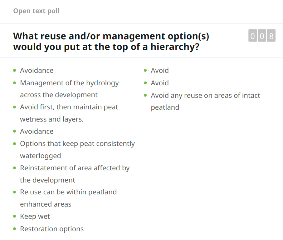 These results highlight our current understanding of peat reuse methods occurring in wind farm construction in Scotland. We have highlighted which environmental issues are critical and how the reuse of peat can maintain the habitat, allowing for environmentally conscious construction techniques to take precedence.