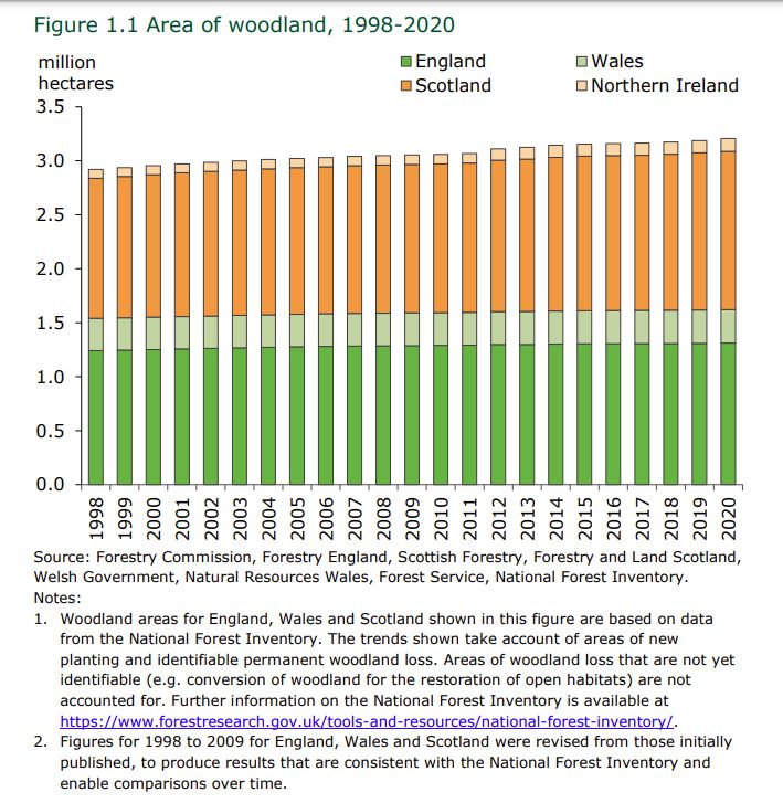 This graph from The Forestry Commission Forestry Statistics 2020 shows total area of woodland increasing in the UK since 1998.